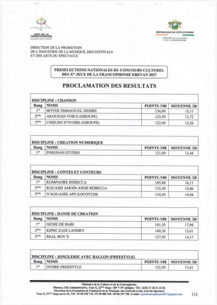 Cette liste de présélectionnés sera ensuite auditionnée par le Comité International des Jeux de la Francophonie (CIJF) et à l’issue de cette audition, la liste définitive des représentants retenus pour la Côte d’Ivoire sera publiée au mois de juillet 2026.