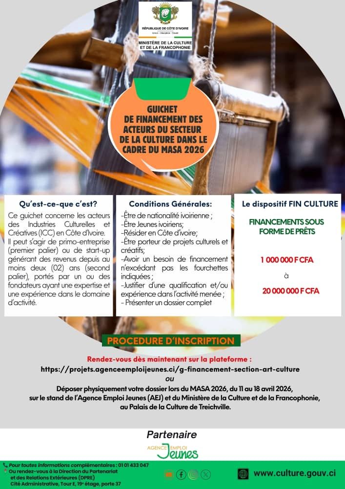 Vous pouvez également déposer physiquement votre dossier lors du MASA 2026, du 11 au 18 avril 2026, sur le stand de l’Agence Emploi Jeunes (AEJ) et du Ministère de la Culture et de la Francophonie, au Palais de la Culture de Treichville.