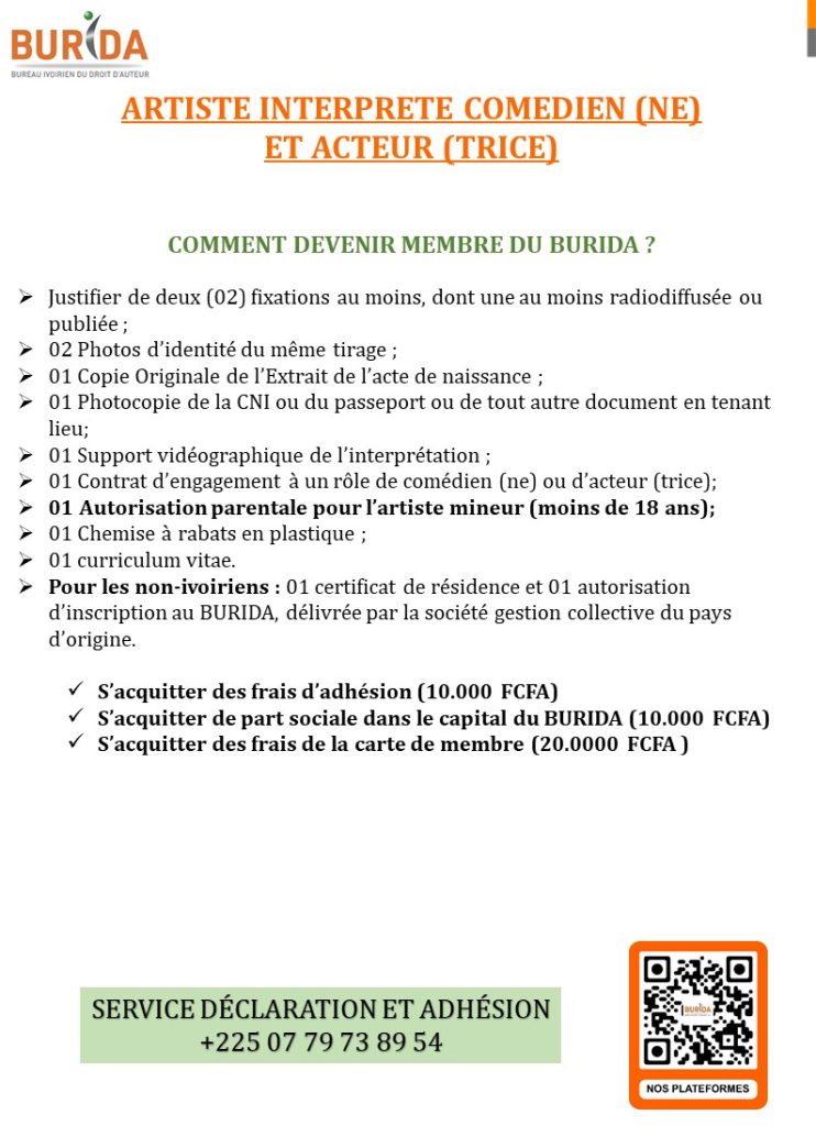 – ๐๐จ๐ฎ๐ซ ๐ฅ๐ž๐ฌ ๐ง๐จ๐ง-๐ข๐ฏ๐จ๐ข๐ซ๐ข๐ž๐ง๐ฌ : 01 certificat de rรฉsidence et 01 autorisation dโ€™inscription au BURIDA, dรฉlivrรฉe par la sociรฉtรฉ gestion collective du pays dโ€™origine.